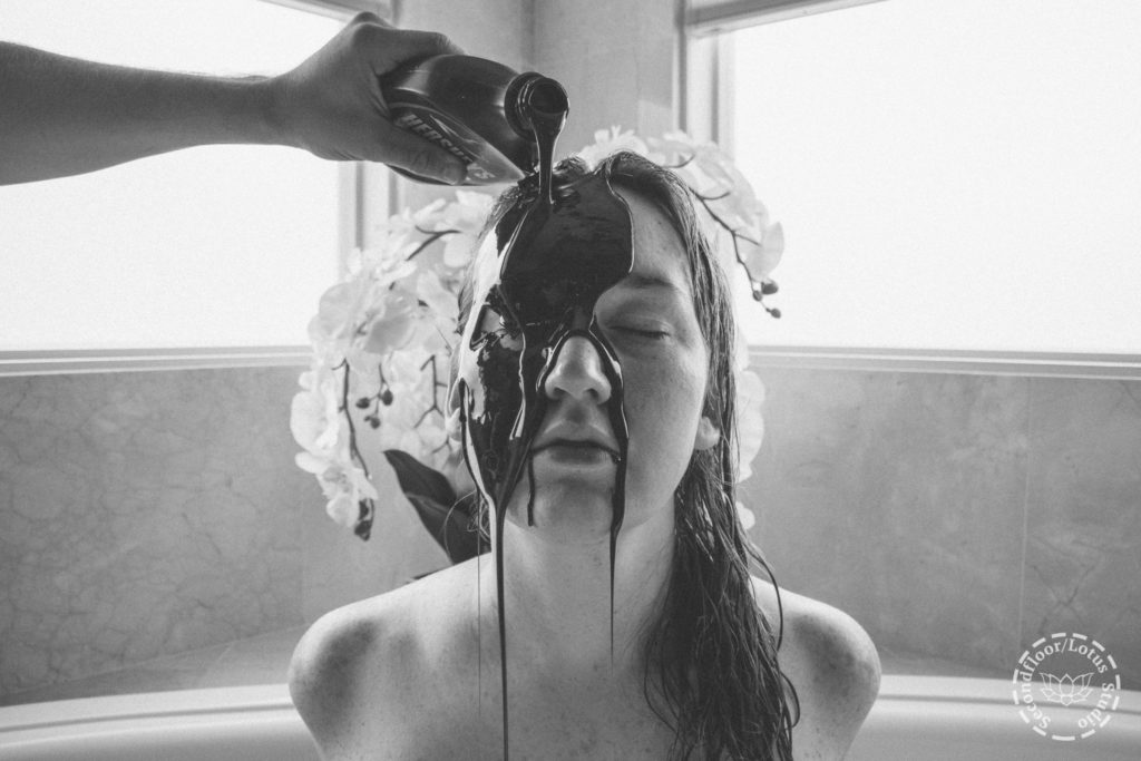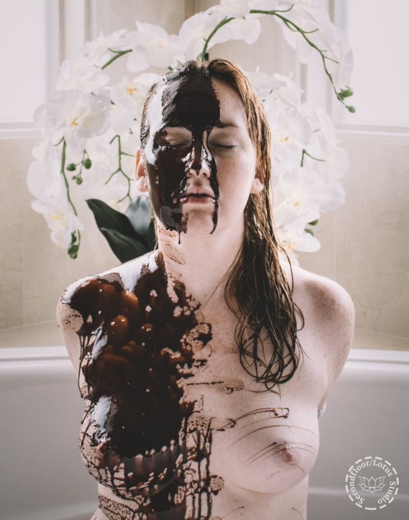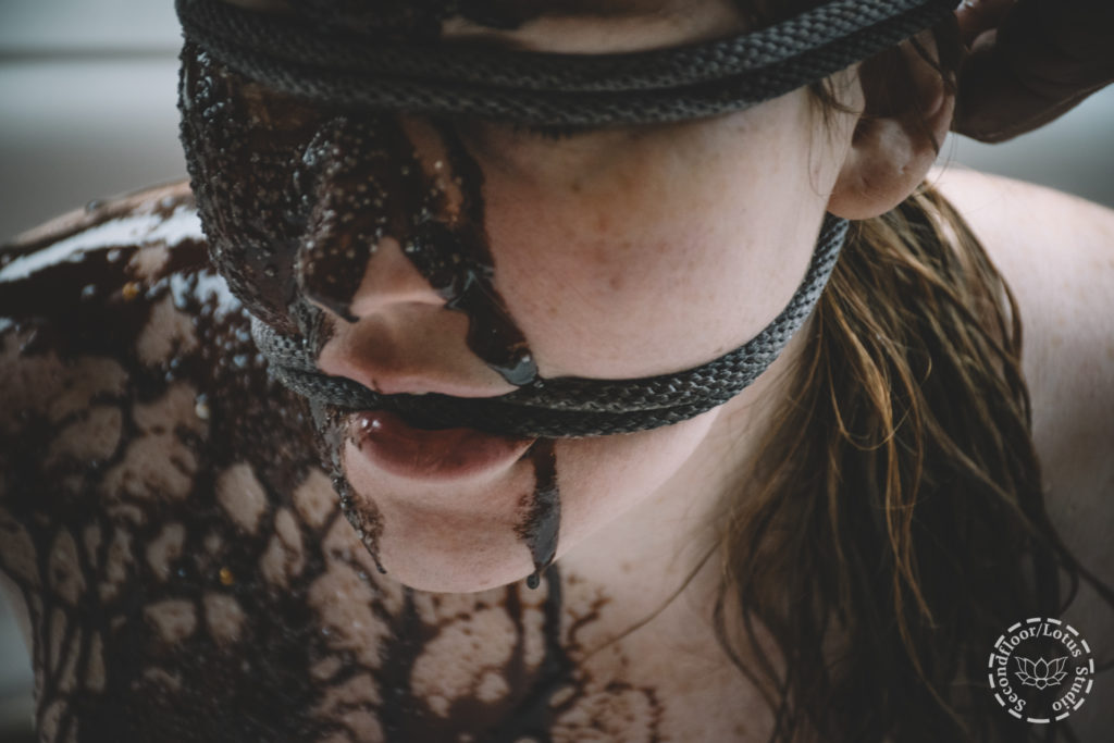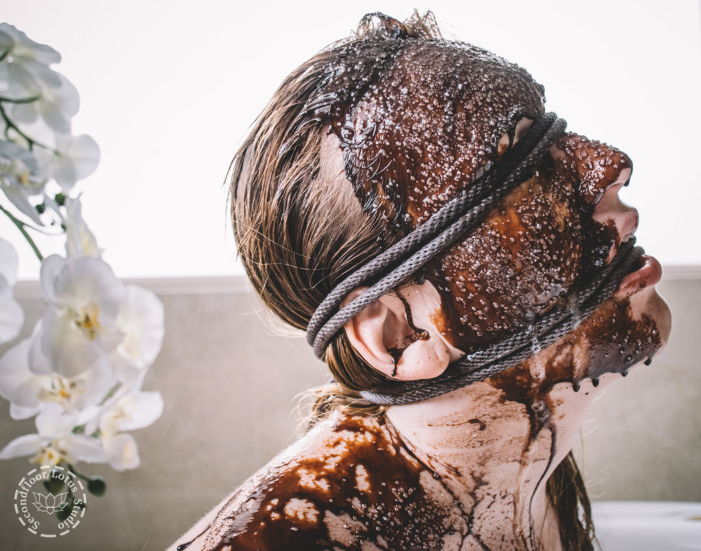 Secondfloor ties Lotus in an armbinder and drizzles Hershey’s chocolate syrup over her face and body and then covers her with sprinkles per her request.