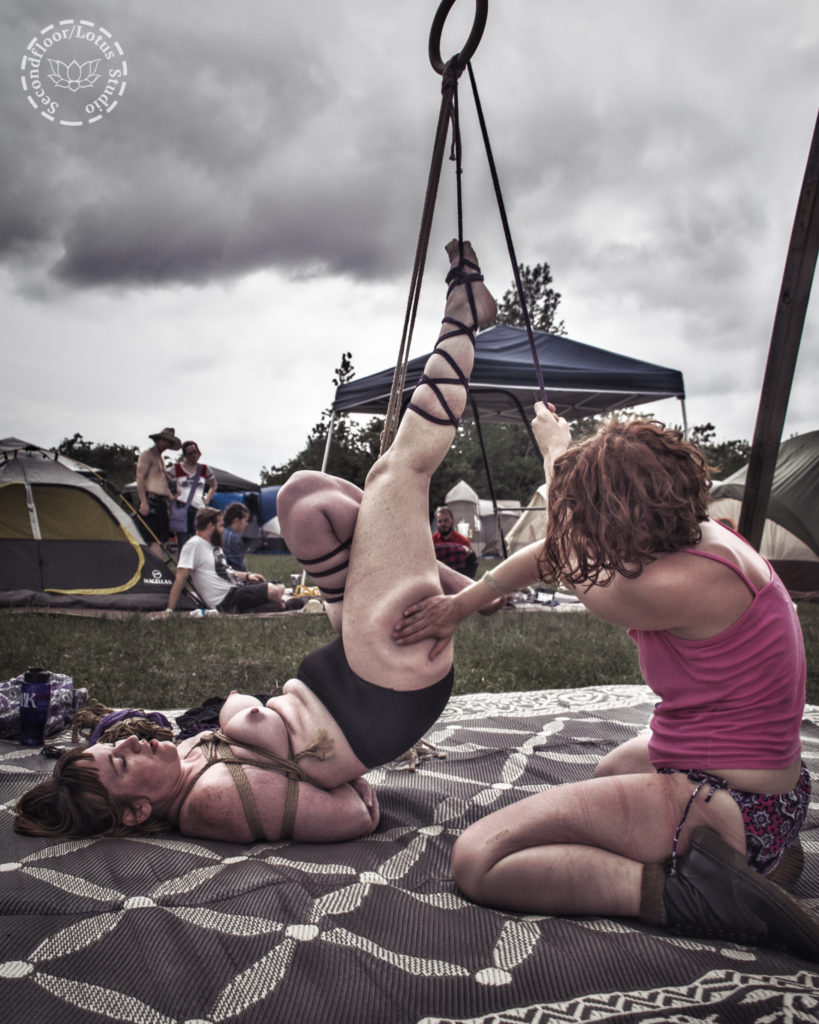 Kel Bowie tying gaping_lotus in a sadistic partial suspension at the campgrounds at Texas Kinky Renaissance Festival.  Shot by Secondfloor.
